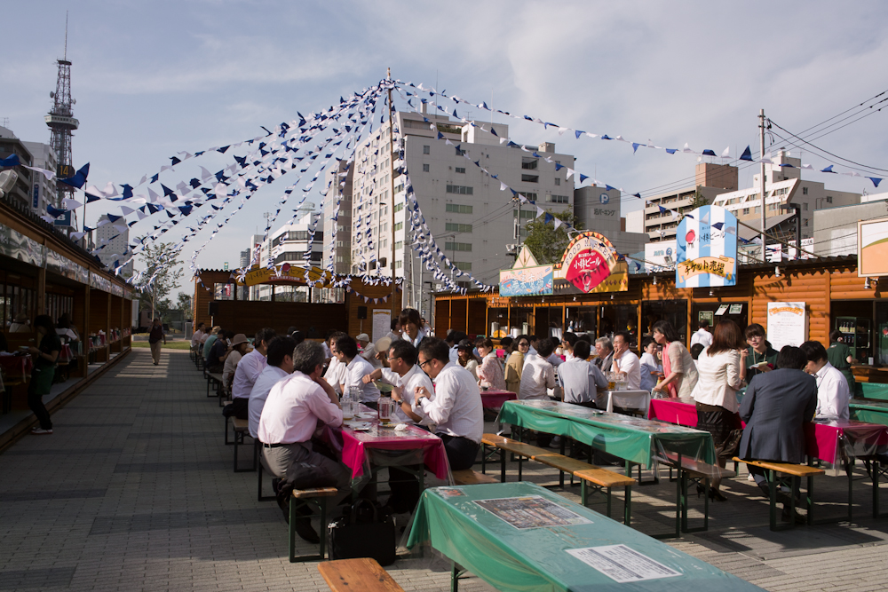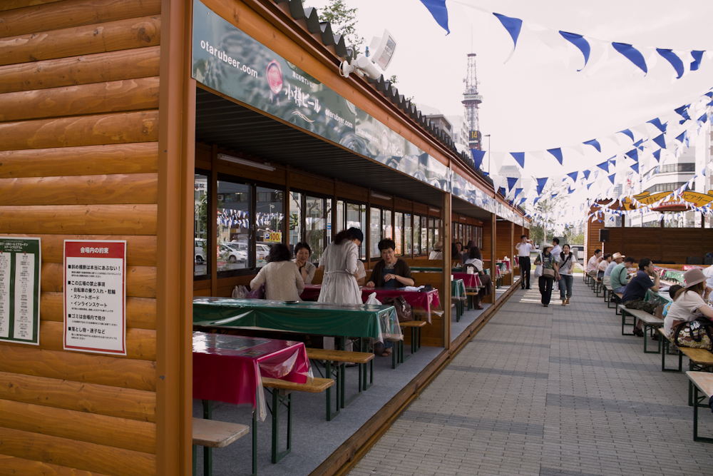 去年までは雨天用にテントを使ってましたが、今年はしっかりした半小屋。これなら少々寒くても平気ですよ。なにしろ札幌の夏はちょっと天気が崩れただけで震えますからね。