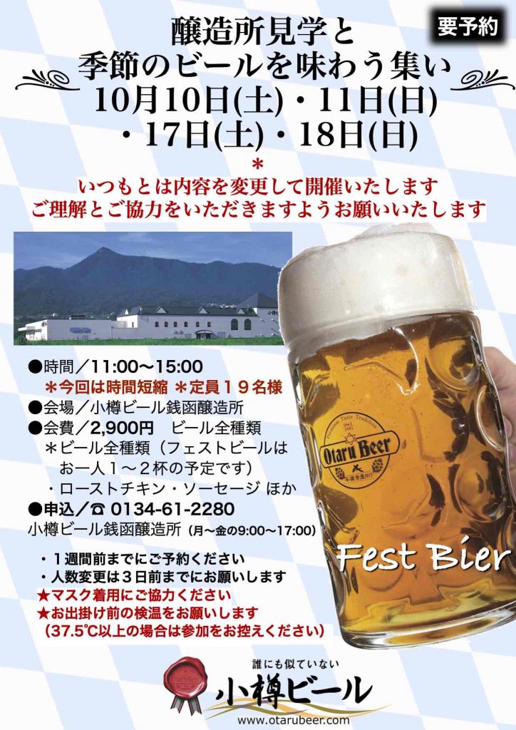 投稿日: 2 10月, 20202 10月, 2020 投稿者: 佐藤 祐正10月の銭函醸造所 見学会 小樽ビール銭函醸造所の見学会を開催いたします。 ようやくの開催ですが、いつもとは違う内容です。 ご理解とご協力をお願いいたします。 楽しいひと時になるよう努力します。小樽ビール