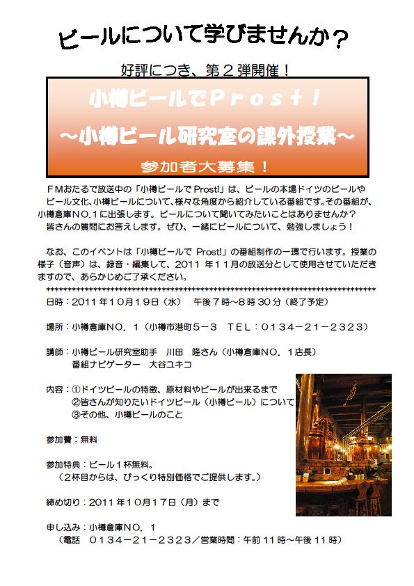 ※ このイベントは「小樽ビールでProst!」の番組制作の一環で行います。授業の様子(音声)は、録音・編集して、2011年10月の放送分として使用させていただきますので、あらかじめご了承ください。
