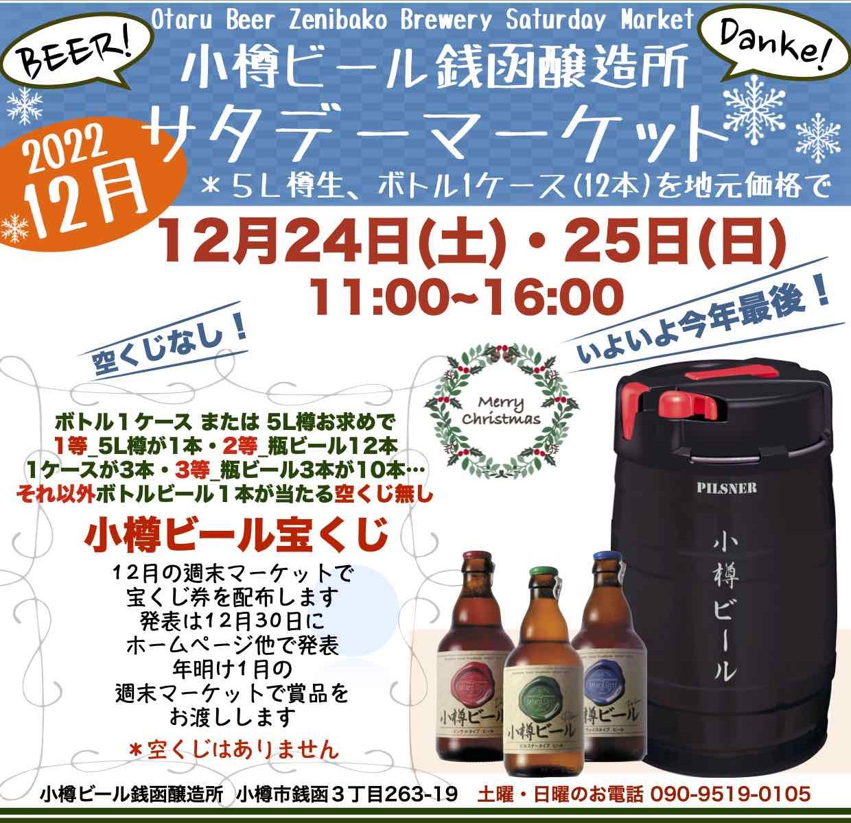 投稿日: 22 12月, 2022 投稿者: 佐藤 祐正銭函醸造所*今年最後の週末マーケット 今年も最終盤に入ります。空クジ無しの小樽ビール宝くじもいよいよ最後です。12月30日に銭函醸造所内に掲示するほか、ホームページ、Facebookで当選番号を発表し、1月の週末マーケットで引き換えとなります。ご期待ください。