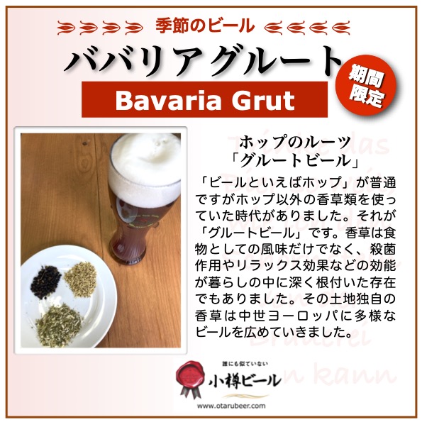 「グルートビール」1516年のビール純粋令公布以前のドイツでは、その土地に自生する様々なハーブやベリーを加えたビールが多く存在していました。ババリアグルートはヴァイスに花の香りやベリーの酸味、シトラスの風味などを加えた奥深く複雑な風味と味わい。ドイツの12世紀13世紀あたりを探索してみたくなります。(飲み放題には含まれません)