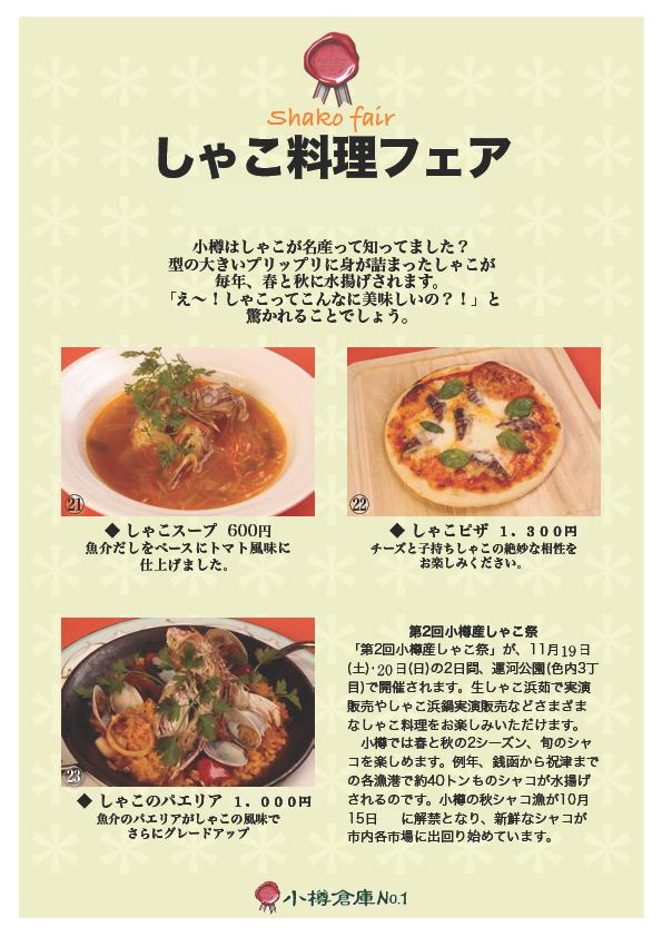 投稿日: 19 11月, 2011 投稿者: 小樽倉庫No.1しゃこ料理フェアー 11月19日(土)~11月23日(水) しゃこ料理フェアーを開催します。 しゃこを洋風にアレンジしました。 是非一度お試しください。