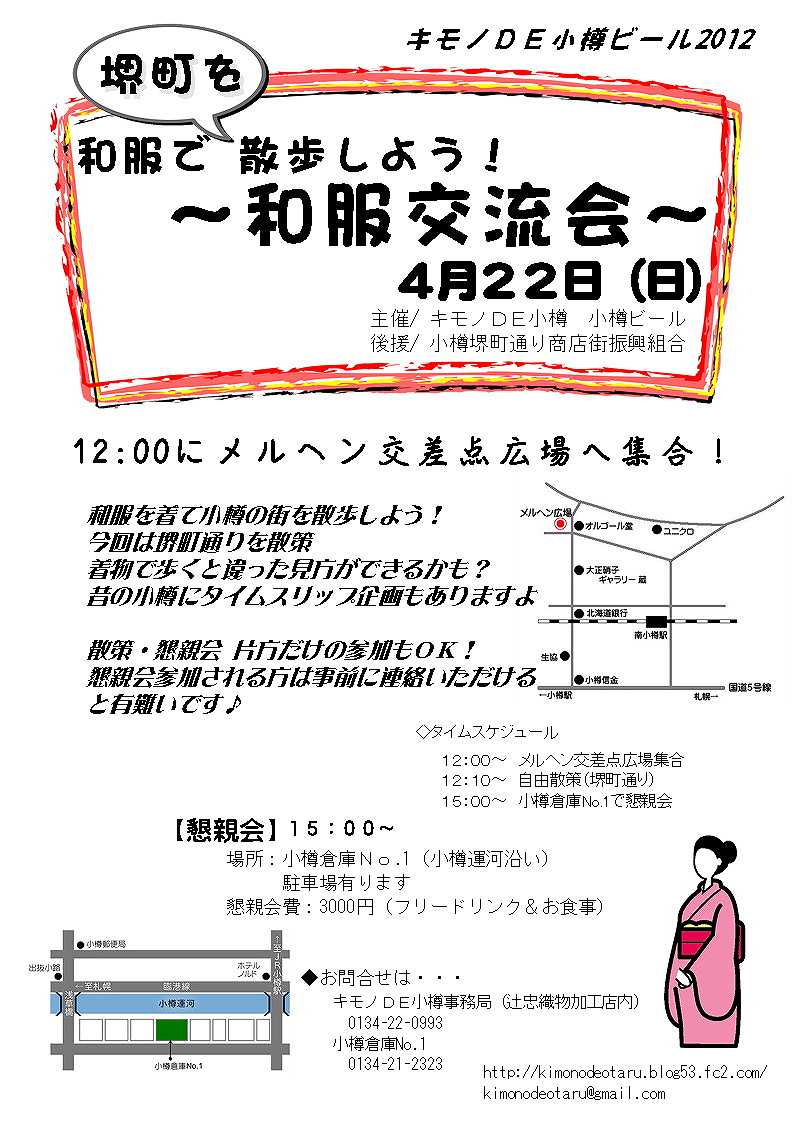 投稿日: 20 4月, 201220 4月, 2012 投稿者: 小樽倉庫No.14月22日(日)和服交流会 キモノDE小樽ビール ~~和服交流会~~ 4月22日(日) 12:00 メルヘン交差点集合 15:00~ 小樽倉庫NO1で懇親会 会費3000円(小樽ビール飲み放題+お食事付) ※ 和服を着て小樽の街を散歩しよう。 今回は堺町通りの散策 着物で歩くと違った見方ができるかも ※ 散策・懇親会片方だけの参加もOK!! お問い合わせ 小樽倉庫NO1 担当 川田 0134-21-2323
