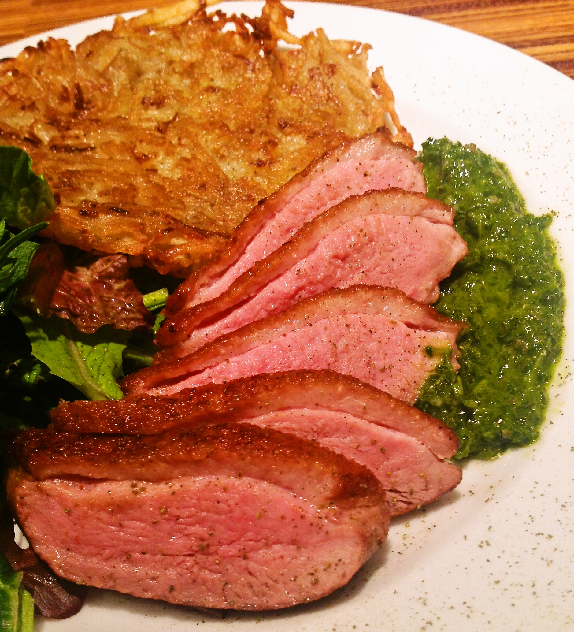 As Autumn begins to wane to Winter, traditional hunters go out in the wild and hunt various different wild game not only in Europe, but also in North America. Some hunters go for Wild Boar, some for Deer, others go for Pheasant or other fowl. One of my favorite wild meats is duck and I have not served duck at Leibspeise in quite a number of years. I think the last time was 2008. Well, I have gotten a supply of French duck breast for Leibspeise this year and thought it would be nice to serve it up with another Autumn favorite, Rösti!